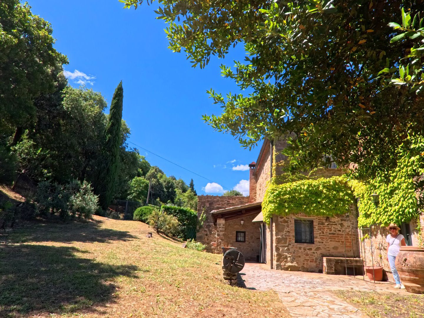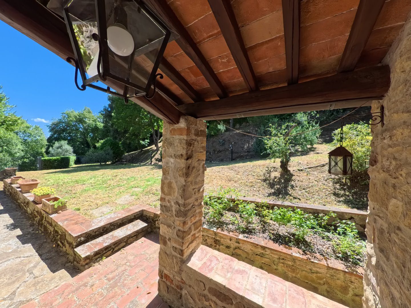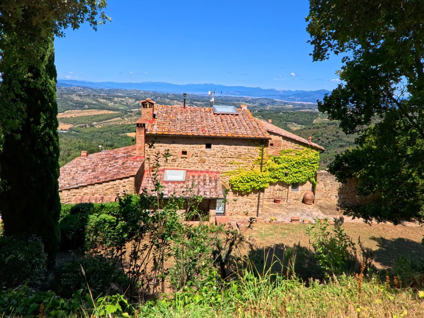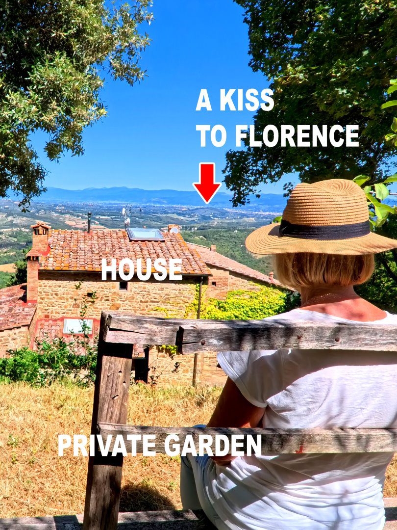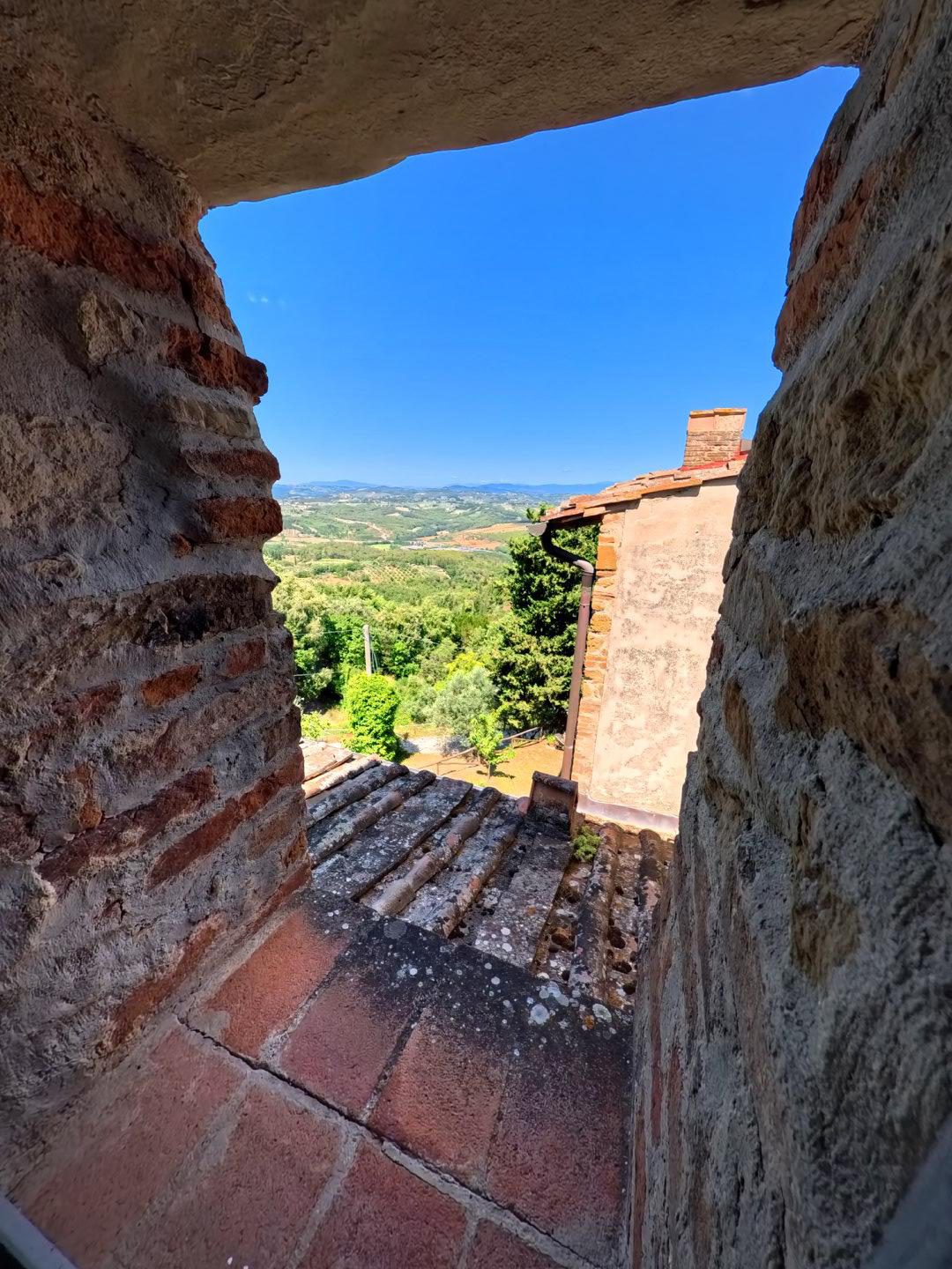 Antico Fabbricato in Pietra con Vista Spettacolare sulla Toscana\nPorzione terra-tetto, indipendente e privata, di antico fabbricato in pietra di cui si ha documentazione storica risalente già dal secolo undicesimo.\n\nProprietà Ristrutturata con Cura\nLa proprietà si sviluppa su tre livelli ed è stata completamente ristrutturata con attenzione alla conservazione e ripristino dei materiali esistenti.\n\nTerreno e Giardino\nLa proprietà include un terreno di circa 9000 mq, composto da:\n- Giardino\n- Uliveto con 50 piante in produzione\n- Alberi da frutta\n- Bosco\n\nNel terreno è presente una capanna in legno utilizzata come deposito attrezzi.\n\nVista Spettacolare\nDalla casa e dal terreno si gode di una vista spettacolare sulle dolci colline costellate di storici villaggi, con la città di Firenze visibile sullo sfondo.\n\nInterni\nLa casa si sviluppa in questo modo:\n\n- Soggiorno con antico camino e pavimentazione in cotto originale\n- Cucina attrezzata\n- Ripostiglio (potenzialmente una cameretta da letto)\n- Cantina con soffitto a volta\n- Due camere da letto\n- Due bagni\n\nServizi e Impianti\n- Riscaldamento a GPL\n- Impiantistica elettrica perfettamente funzionante\n- Parcheggio coperto privato ed esclusivo per due auto\n\nInformazioni Utili\n- Difficilmente si potrà ottenere il permesso per la costruzione di una piscina interrata, mentre sono ammesse quelle fuori terra.\n\nSe stai cercando una proprietà unica e storica con una vista spettacolare sulla Toscana, questa potrebbe essere l'opportunità giusta per te. - Maggiori Dettagli: Vista panoramica, Vista campagna, Vicino a fiume, Vicino a negozi, Vicino a ristorante, Vicino ai servizi, Aeroporto entro 1 ora, Giardino, Alberi da frutto, Alberi di ulivo, Piscina possibile, Caminetto, Barbecue, Corte privata, Accesso con l'auto, Garage