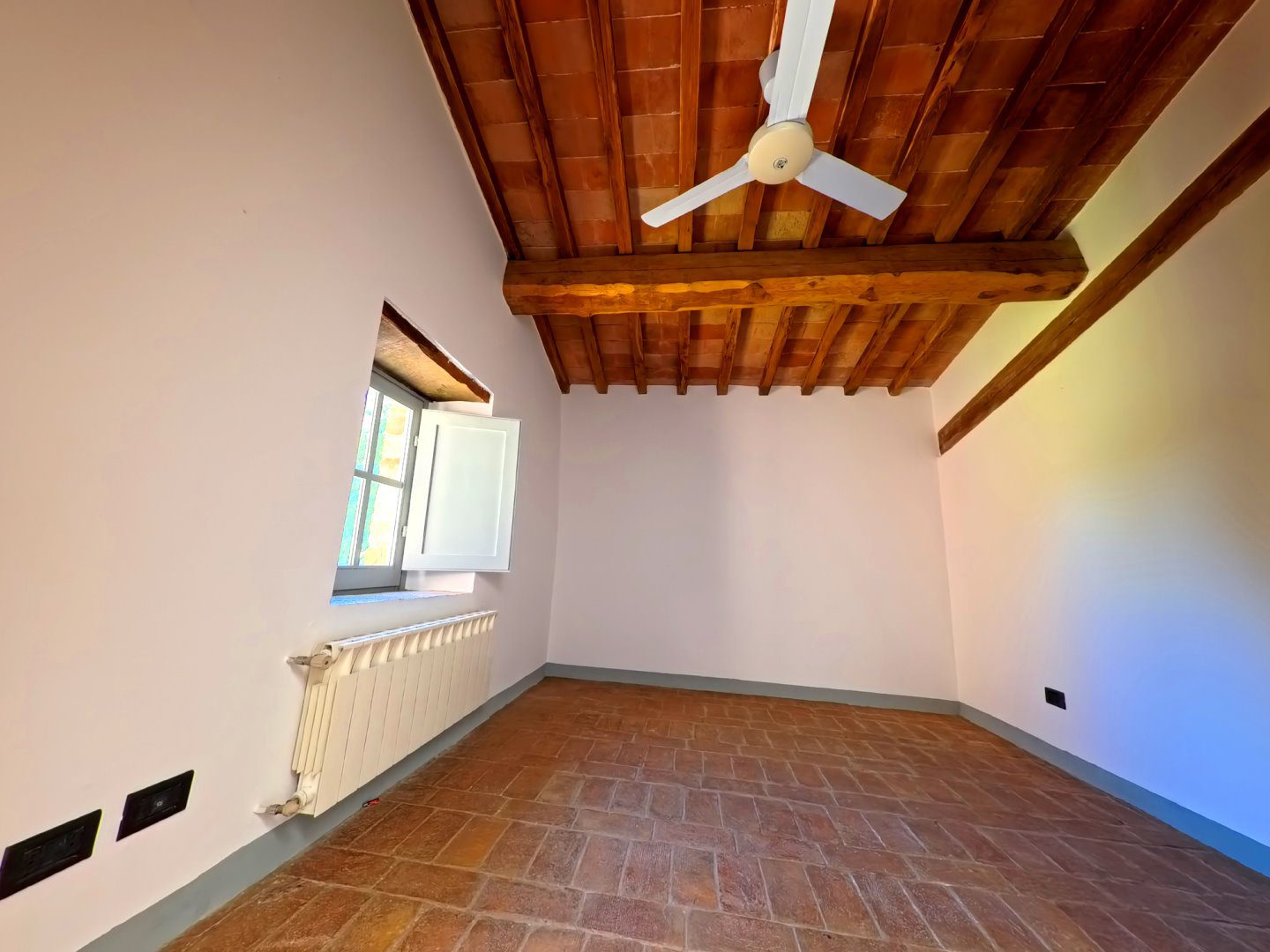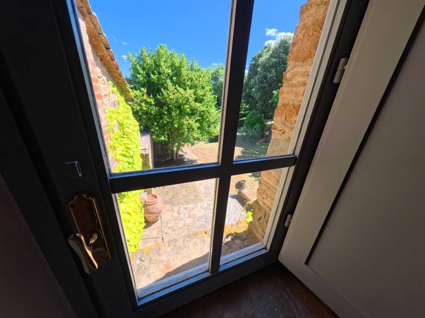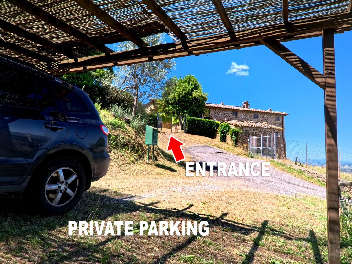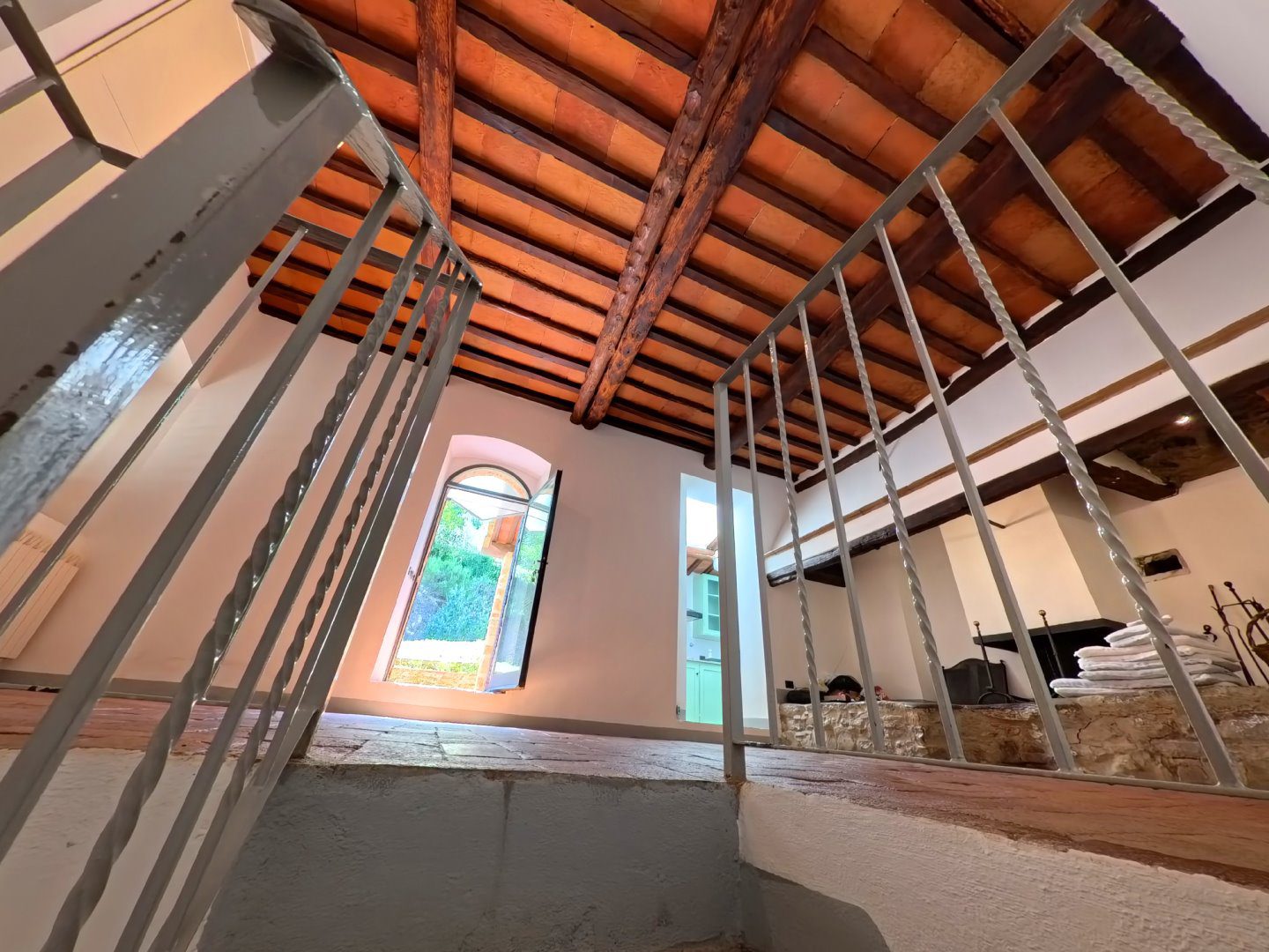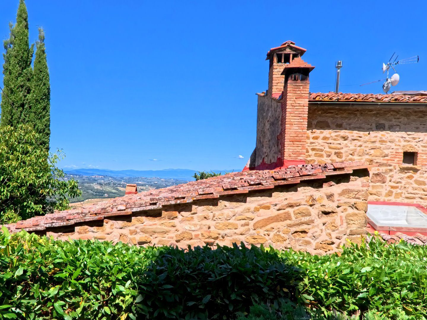 Antico Fabbricato in Pietra con Vista Spettacolare sulla Toscana\nPorzione terra-tetto, indipendente e privata, di antico fabbricato in pietra di cui si ha documentazione storica risalente già dal secolo undicesimo.\n\nProprietà Ristrutturata con Cura\nLa proprietà si sviluppa su tre livelli ed è stata completamente ristrutturata con attenzione alla conservazione e ripristino dei materiali esistenti.\n\nTerreno e Giardino\nLa proprietà include un terreno di circa 9000 mq, composto da:\n- Giardino\n- Uliveto con 50 piante in produzione\n- Alberi da frutta\n- Bosco\n\nNel terreno è presente una capanna in legno utilizzata come deposito attrezzi.\n\nVista Spettacolare\nDalla casa e dal terreno si gode di una vista spettacolare sulle dolci colline costellate di storici villaggi, con la città di Firenze visibile sullo sfondo.\n\nInterni\nLa casa si sviluppa in questo modo:\n\n- Soggiorno con antico camino e pavimentazione in cotto originale\n- Cucina attrezzata\n- Ripostiglio (potenzialmente una cameretta da letto)\n- Cantina con soffitto a volta\n- Due camere da letto\n- Due bagni\n\nServizi e Impianti\n- Riscaldamento a GPL\n- Impiantistica elettrica perfettamente funzionante\n- Parcheggio coperto privato ed esclusivo per due auto\n\nInformazioni Utili\n- Difficilmente si potrà ottenere il permesso per la costruzione di una piscina interrata, mentre sono ammesse quelle fuori terra.\n\nSe stai cercando una proprietà unica e storica con una vista spettacolare sulla Toscana, questa potrebbe essere l'opportunità giusta per te. - Maggiori Dettagli: Vista panoramica, Vista campagna, Vicino a fiume, Vicino a negozi, Vicino a ristorante, Vicino ai servizi, Aeroporto entro 1 ora, Giardino, Alberi da frutto, Alberi di ulivo, Piscina possibile, Caminetto, Barbecue, Corte privata, Accesso con l'auto, Garage